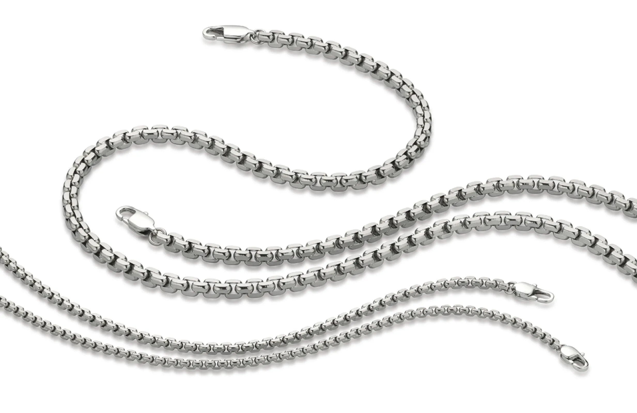 Our brand new masculine rounded box diamond-cut chain comes in stainless steel, silver and gold.
